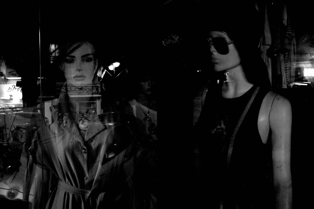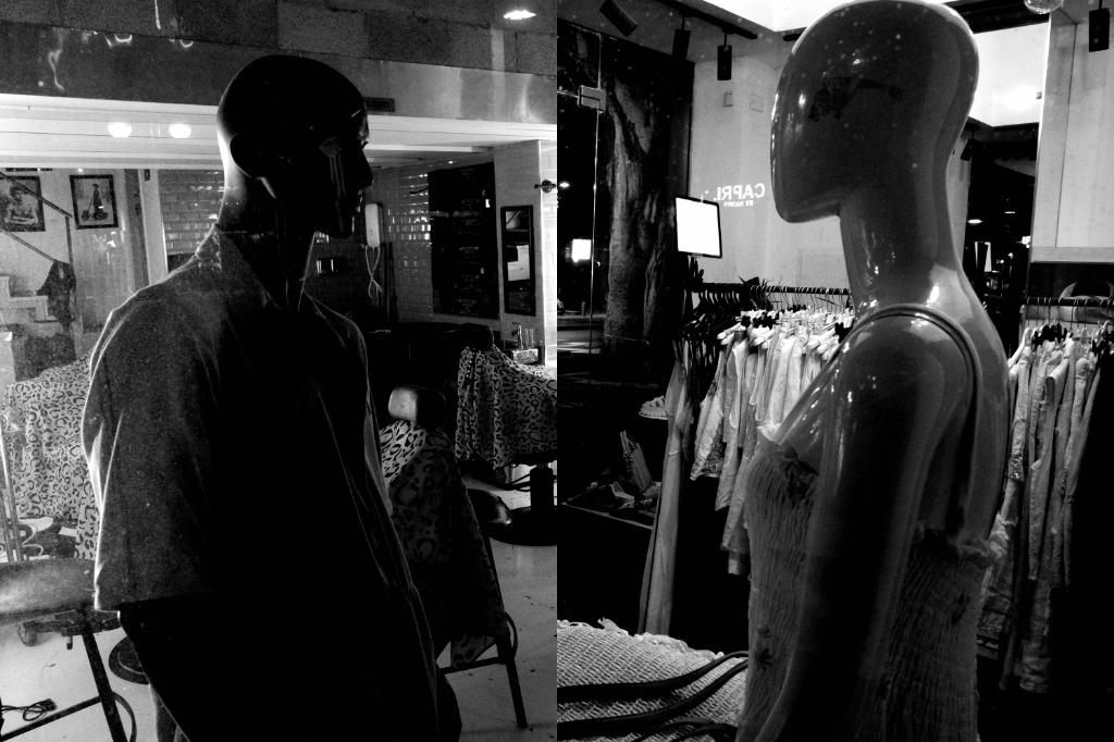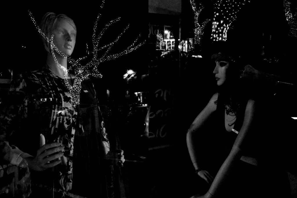 Diptychs made from pictures I took while strolling the streets late at night. Mannequins nightlife.
