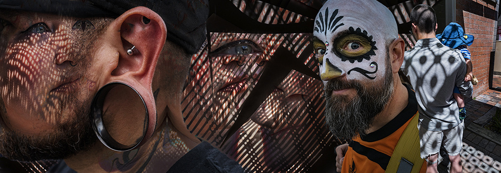 I began the “street story montages” seven years ago. They are part of my ongoing An American Journey Continues project, with a couple of them included in my book: Street Cat Tales and Tangled Times (2023). Reoccurring subjects include mannequins, costumes and makeup, and other types of body ornamentation found at cultural festivals, parades, and on the everyday streets. Assembled utilizing two to six photographs, each digital montage is inhabited by at least one person.